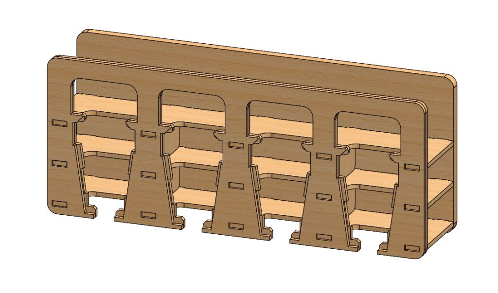 It was important that this tool jig would not damage the finished product, so it was designed and manufactured from wood to accommodate this requirement. The jig assisted with assembling a handheld device and needed to be able to be easily taken apart for flat pack storage when not required.